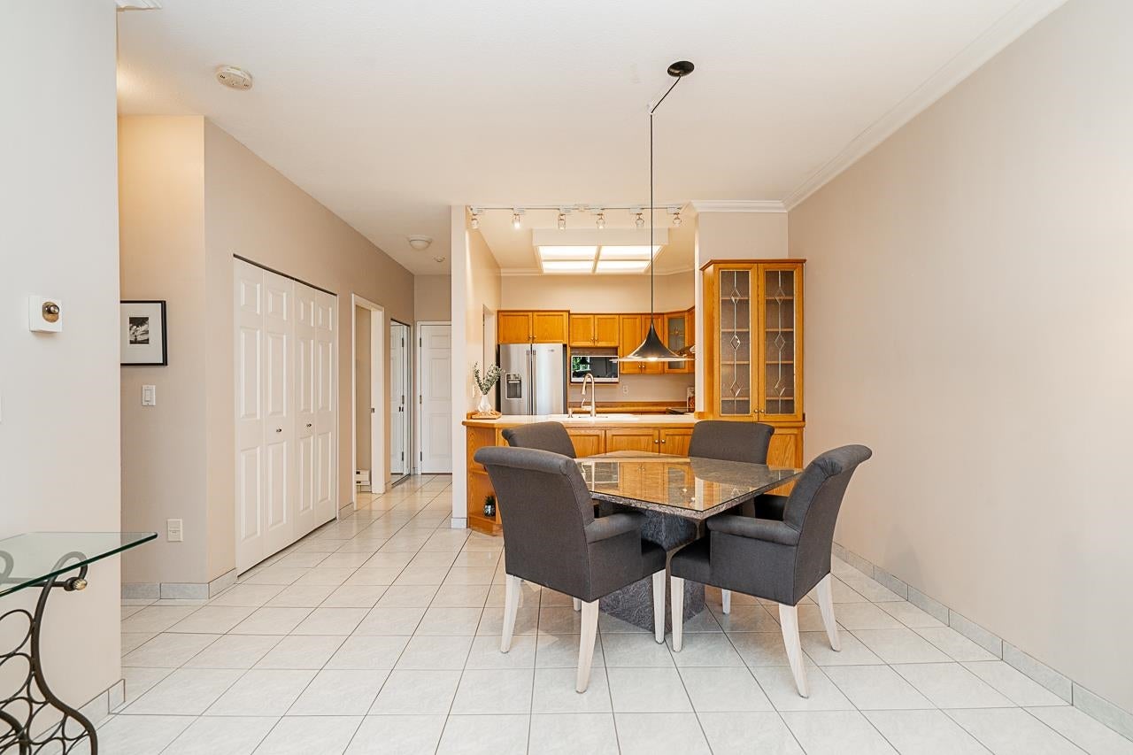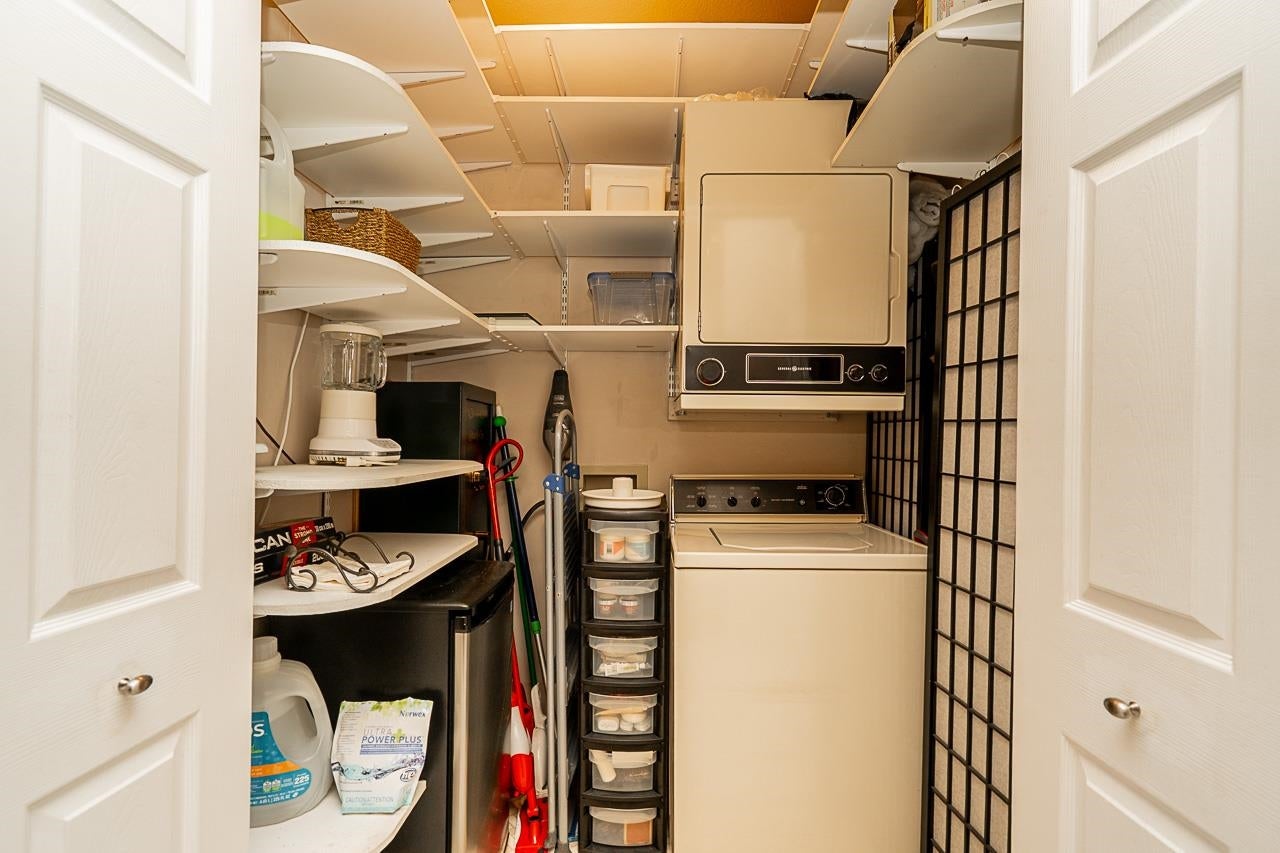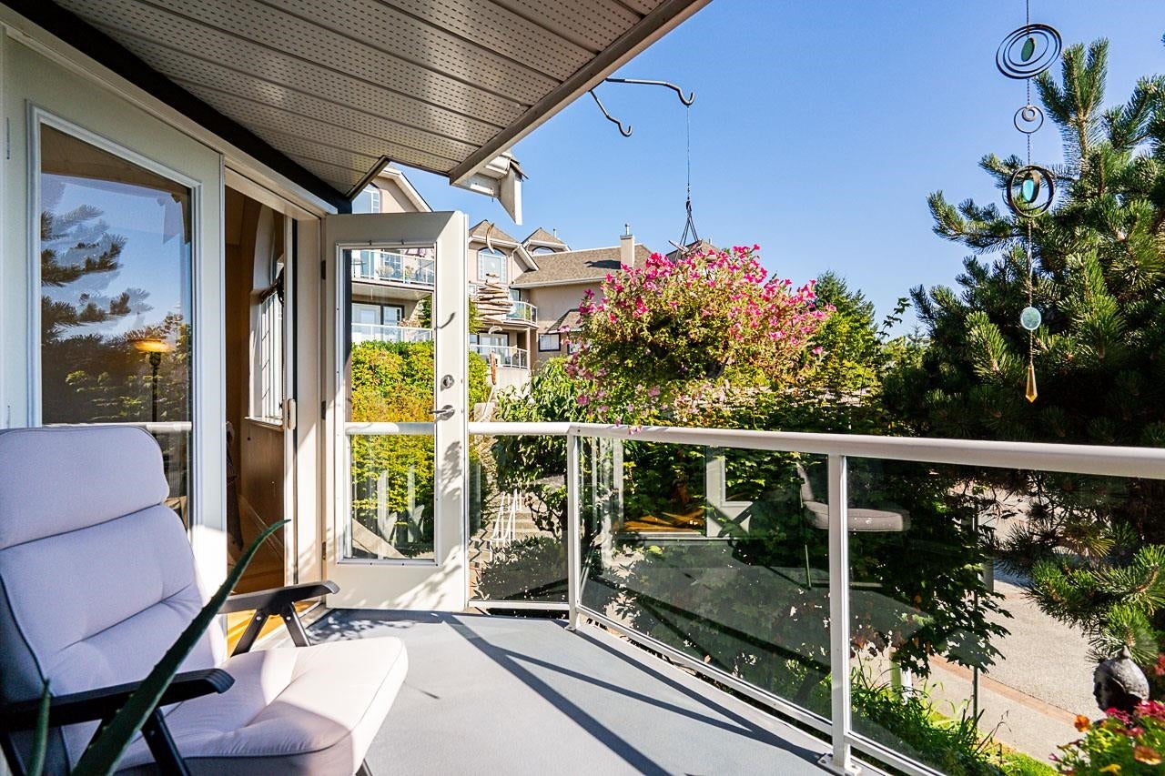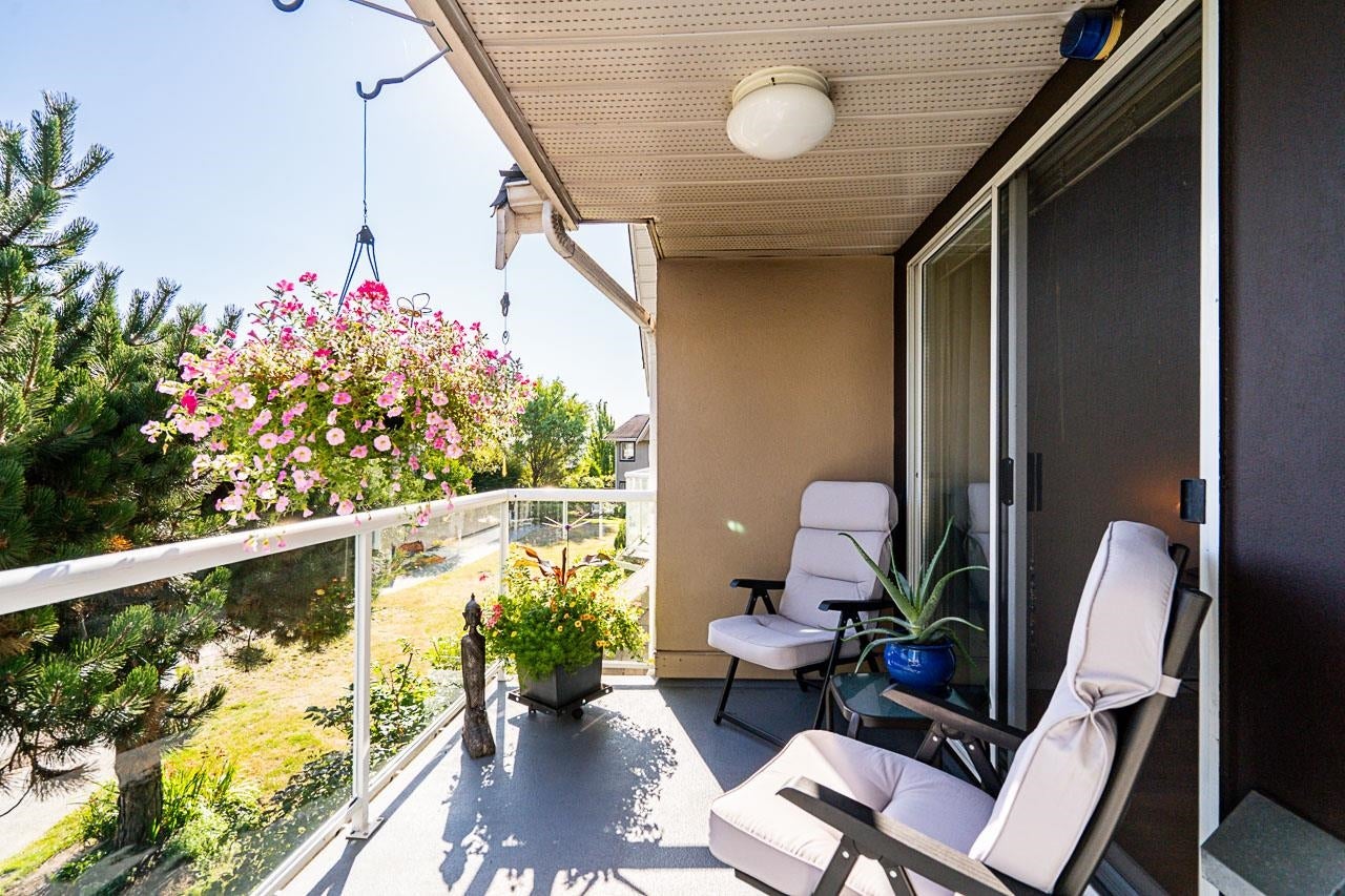 Prime walkable location! This move-in ready, top-floor, end unit in the sought-after FRASERVIEW adult-oriented community is steps to parks, dining, shopping, hospital, bus, SkyTrain and the new aquatic and community centre. Meticulously maintained by the original owner, it features 9’ and vaulted ceilings, a bright open layout, engineered hardwood and tile flooring, crown mouldings, stainless appliances, and a cozy gas fireplace—BONUS gas and hot water included in the strata fee! The spacious bedroom fits a king bed and opens to a private covered balcony overlooking the quiet courtyard. Includes in-suite laundry, 1 parking, and a large storage locker.