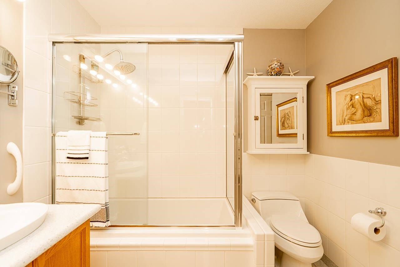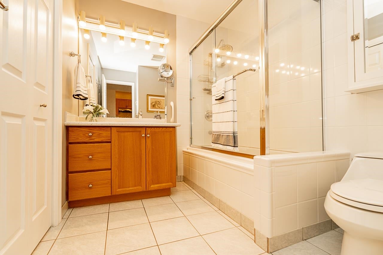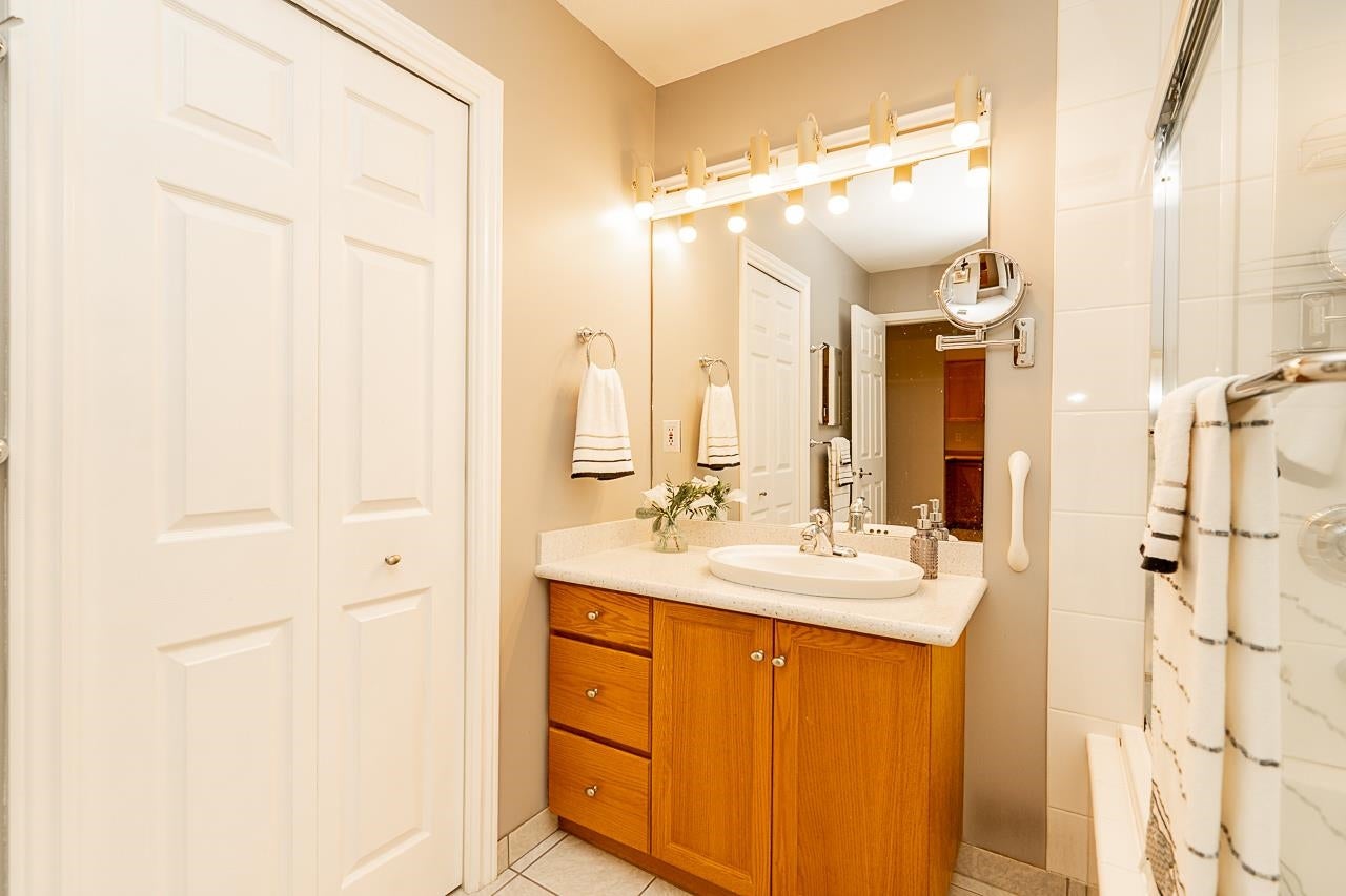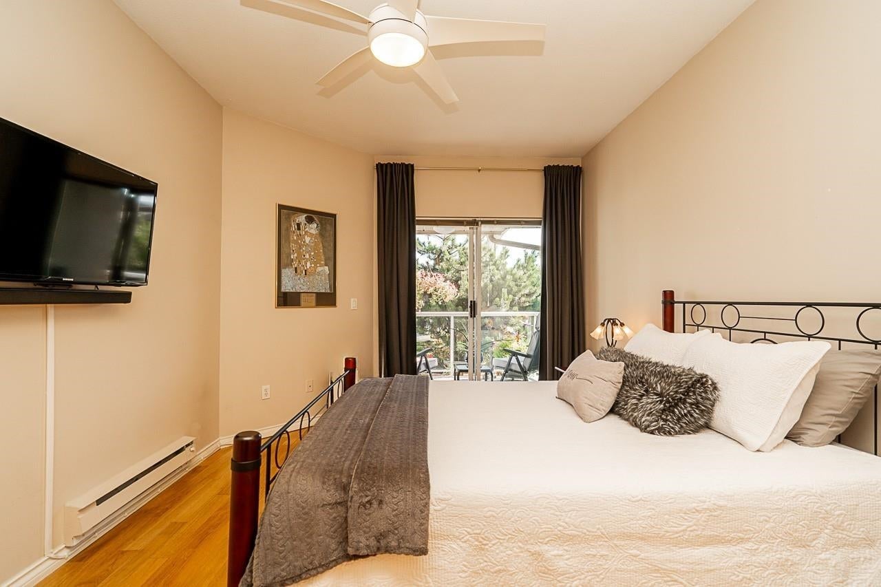 Prime walkable location! This move-in ready, top-floor, end unit in the sought-after FRASERVIEW adult-oriented community is steps to parks, dining, shopping, hospital, bus, SkyTrain and the new aquatic and community centre. Meticulously maintained by the original owner, it features 9’ and vaulted ceilings, a bright open layout, engineered hardwood and tile flooring, crown mouldings, stainless appliances, and a cozy gas fireplace—BONUS gas and hot water included in the strata fee! The spacious bedroom fits a king bed and opens to a private covered balcony overlooking the quiet courtyard. Includes in-suite laundry, 1 parking, and a large storage locker.
